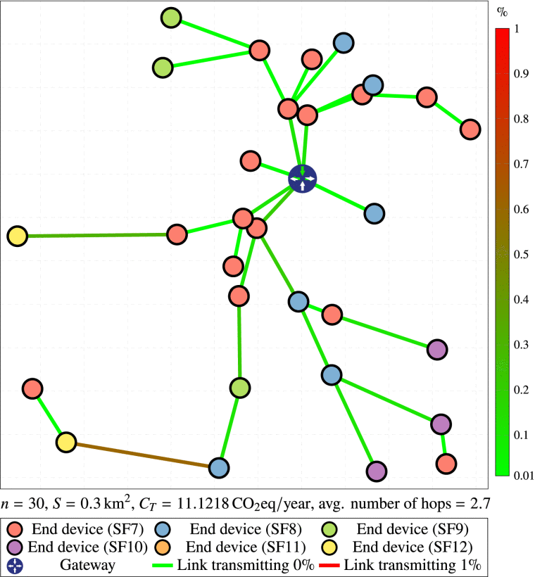 The Internet of Things (IoT) is gaining significant attention for its ability to digitally transform various sectors by enabling seamless connectivity and data exchange. However, deploying these networks is challenging due to the need to tailor configurations to diverse application requirements. To date, there has been limited focus on examining and enhancing the carbon footprint (CF) associated with these network deployments. In this study, we present an optimization framework leveraging machine learning techniques to minimize the carbon footprint (CF) associated with IoT multi-hop network deployments by varying the placement of the required gateways. Additionally, we establish a direct comparison between our proposed machine learning method and the integer linear program (ILP) approach. Our findings reveal that placing gateways using neural networks can achieve a 14% reduction in the reduction in the CF for simple networks compared to those not using optimization for gateway placement. The integer linear program (ILP) method could reduce the CF by 16.6% for identical networks, although it incurs a computational cost more than 250 times higher, which has its own environmental impact. Furthermore, we highlight the superior scalability of machine learning techniques, particularly advantageous for larger networks, as discussed in our concluding remarks.